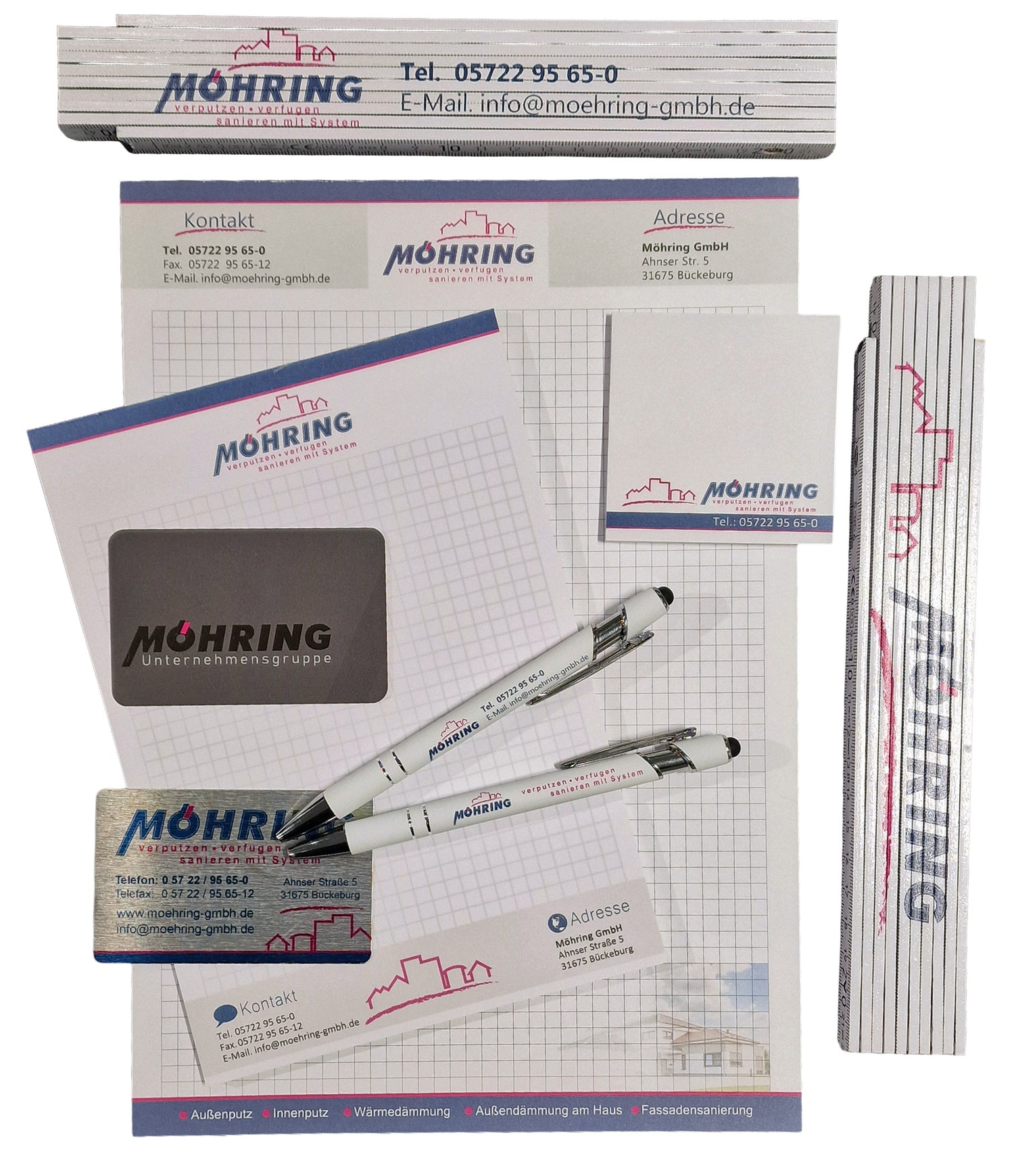 Für den Möhring Fug- und Putzbetrieb haben wir unterschiedliche Geschäftsdrucksachen und Werbeartikel produziert – von klassischen Notizblöcken und Visitenkarten bis hin zu personalisierten Kugelschreibern und Zollstöcken im UV-Direktdruck.